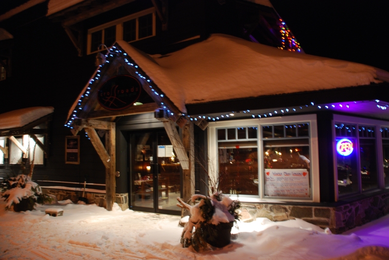 ディナーは、道路を挟んですぐのレストラン「クロスロード」へ。「ここもライダーたちに大人気の店なんだ。もちろん車でも来られる店だが、冬はあえてスノーモビルで食事に来るのがオンタリオ流だね」とロビン。