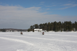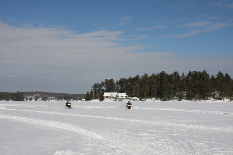 この陽気でロビンとダンも絶好調なのか、昨日は迂回した凍った湖上の横断を提案してきた。湖上は正式なトレイルではないが、真冬はトラックも走れるほど厚く凍っており、スノーモビルに最適なのだ。
