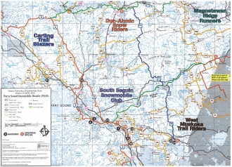オンタリオ州マスコーカ近郊のスノーモービル専用トレイルMAP