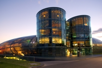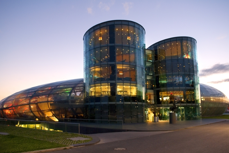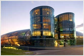 ザルツブルクの中心街より車で約15分。住宅街を抜けると国際空港に到着します。エナジードリンクの世界シェア1位を誇り、F1をはじめ、数々のエクストリームスポーツのスポンサーとして知られるレッドブル社が展開する「ハンガー7」は、空港の敷地内の飛行機格納庫(=ハンガー)が並ぶエリアにあります。「7」と名づけられたのは、1~6まで、空港管轄の格納庫があるため。「ハンガー7」もマテシッツ氏の飛行機コレクションの格納をきっかけに作られました。格納庫とは言っても、巨大なシューズボックスのような無機質なものとは別格。曲線を描く透明感あふれるドーム型の建築は、それだけで芸術作品の風格があります。