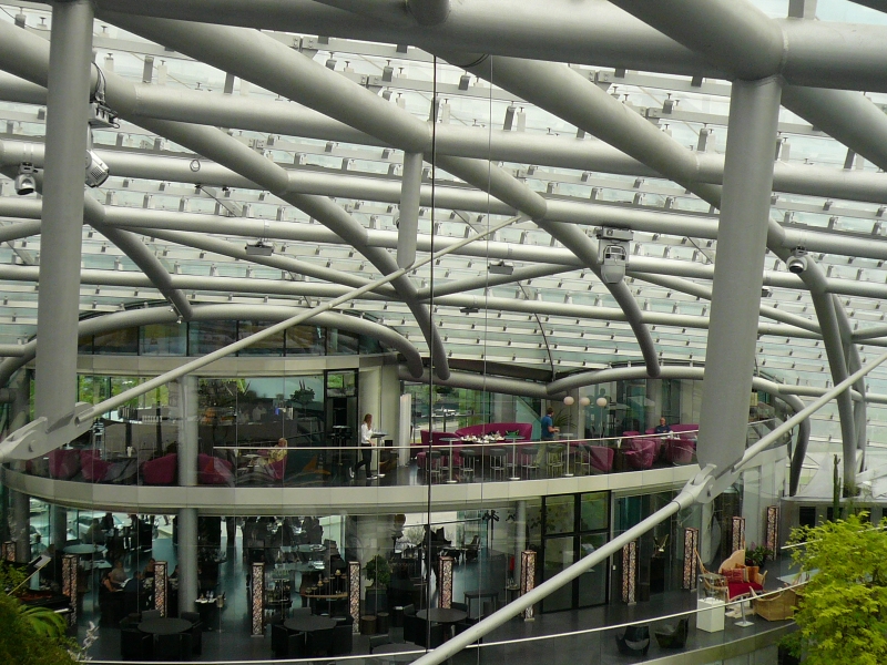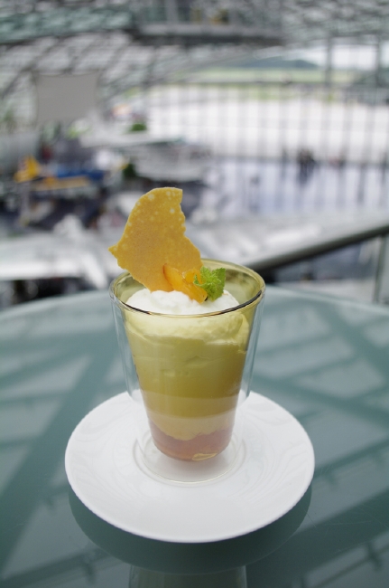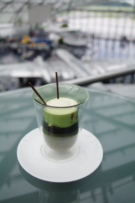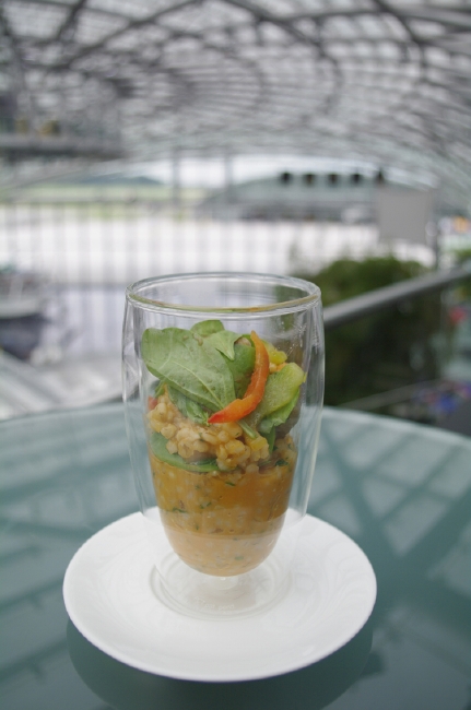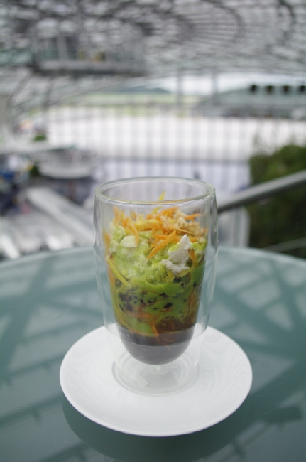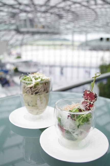 なかでも興味をそそられたのが食へのこだわり。「ハンガー7」には、4つの食空間があります。月替わりで世界中からシェフを招聘し、独創的なメニューを楽しめるレストラン「Ikarus(イカロス)」、飛行機を眺めながらのんびりとくつろげる「Carpe Diem lounge Cafe(カルペ・ディエム・ラウンジ・カフェ)」。陽が暮れると照明がともり、天空に浮かび上がるバー「Three sixty Bar(スリーシックスティ・バー)」。そして、イカロスのエグゼクティブシェフ、ローランド・トレットル氏とスイスの栄養科学者マリアンヌ・ボッタ女史とのコラボレーションで誕生した食スタイル、“スマートフード”を提案する「Mayday Bar(メイデイ・バー)」。
