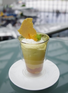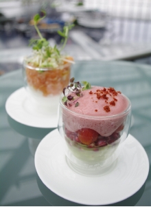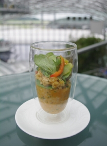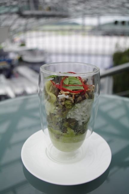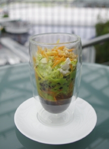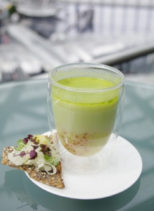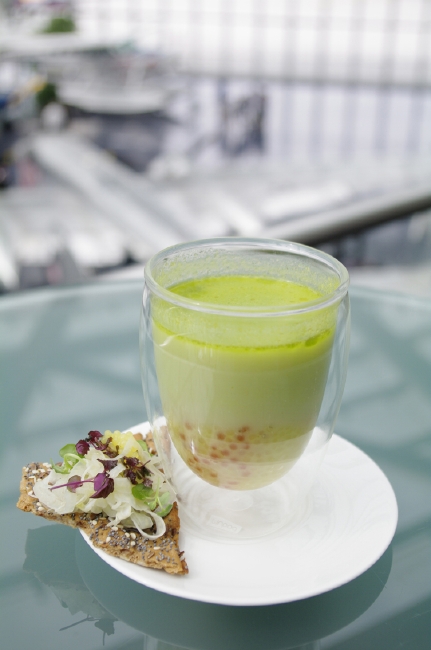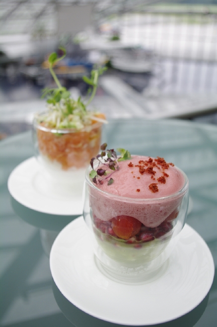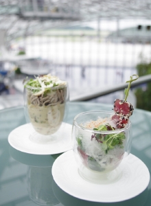 ブレイン(脳)、ビューティ(美)、ムード(雰囲気)の3つのテーマからなるスマートフードは、前菜からデザートまですべてグラスでサーブされるのが特徴。季節の食材を中心に蕎麦や豆腐などの和の食材を積極的に取り入れ、色合いや盛り付けはアートのように。グラスに盛り付けられているので、フォークやスプーンだけで手軽に食べられるのも面白いところでしょう。