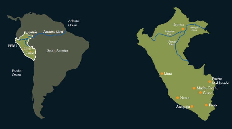 アマゾン川はブラジルを東西に横断して大西洋に流れる全長約6,500メートルの大河。上流はペルーに位置し、ペルーの国土の60%はアマゾン川流域に該当する。