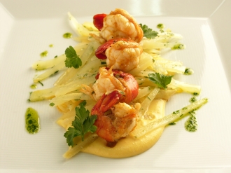 リマのスターシェフ、ペドロ・ミゲル・スチアフィーノは、N.Y.やイタリアで学び、フランスの3ツ星レストランで修行した。アクア・エクスペディションのために監督した料理では、キャッサバやユッカを発酵させた地元のビールを使うなど、アマゾンのDNAを覗かせる。写真はワンカイーナソースを添えたエビ。ワンカイーナは、アヒ(緑唐辛子)、塩、オイル、チーズ、ハーブなどで作るペルーならではのソース。