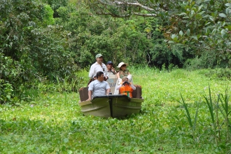 翌朝6時30分。川に昇る朝日と共に起床すると、スイートルームの大きな窓一面は緑の世界。映画を見ているのかと目を疑いつつ、やがて熱帯雨林の奥地に足を踏み入れたことを実感。ビュッフェスタイルの朝食を食べ、9時過ぎには小型ボートに乗り込む。さあ、最初の探検はイグアナの島と呼ばれるヤカパナ島だ。「触れれば皮膚が同化してしまう」とアマゾンの人々が信じるイグアナ。この原始の動物が目の前に現れたとき、果たして我々は触るべきか否か? それは各自の判断にお任せしよう。さらに花や動物の素晴らしい写真を撮り、牛肉を餌にピラニア・フィッシングにも挑戦。ボートは正午前にアリア号へと戻って行く。