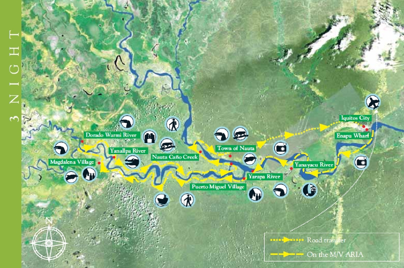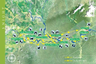 アクア・エクスペディションのコースは3泊か4泊、もしくはその両方を足した7泊。アリア号とアクア号ではルートも出発曜日も違うので、フライトスケジュールや好みに合わせて6つのコースから選ぶことになる。また、雨季(12~5月)と乾季(6~11月)でも内容は異なる。今回は、水がたっぷりある雨季のアリア号3泊のコースを覗いてみよう(注:ツアーは天候や水位などにより変更します)。