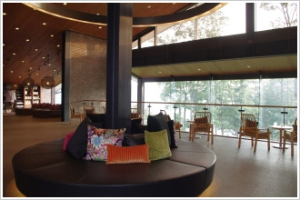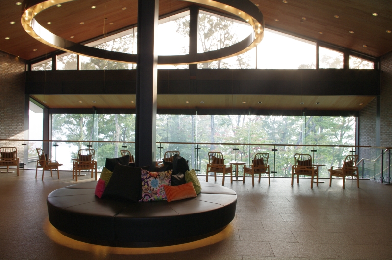 半島の斜面に建てられたホテルのまわりは森。その先には野尻湖が広がり、時おり遠くに聞こえるのは水上スキーの水を切る音、または鳥たちのさえずり、風で葉が擦れる音…。ロビーの大きなピクチャーウインドから望めるのは、森の斜面を通り過ぎるリスや兎などの野生動物だけ。あたかもプライベートアイランドにいるような錯覚を抱くほどだ。