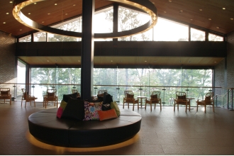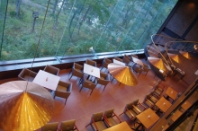 訪れたゲストを最初に迎えてくれるのは、天井までとられた一面のガラスの向こうに広がる何千種類もの緑のグラデーション。そのまま森へ吸い込まれそうなほど自然を近くに感じる。