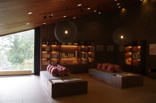 そして、どっしりと腰を落ち着ける―そんな気分にさせる演出がそこかしこにが用意されている。館内で目を引くのは、ロビーの中心にそびえる大きな柱。それをぐるりと囲むようにソファが配され、一角には長年使われている暖炉が。奥へ目を向けると、レンガの壁伝いに配された棚に地元にゆかりのあるミヒャエル・エンデやいわさきちひろの著書、写真集や建築雑誌などが置かれたライブラリーも。所蔵数は250冊以上という。
