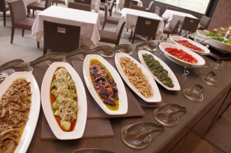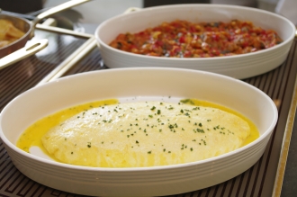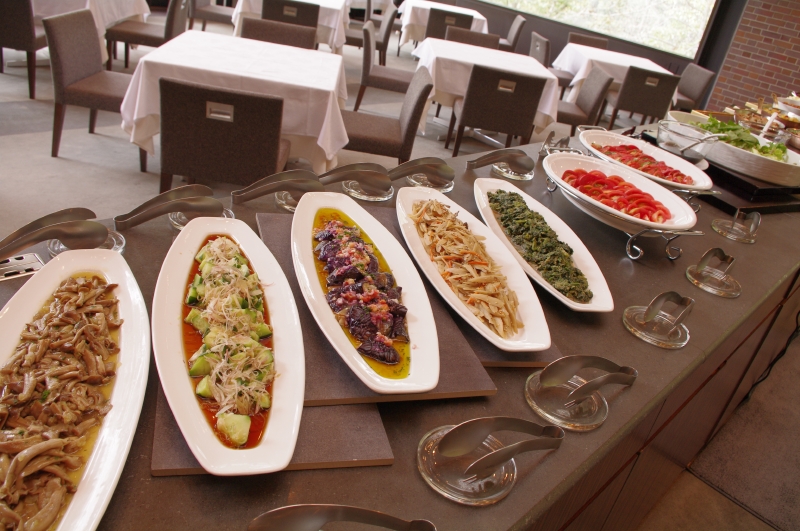さて、滞在の楽しみのひとつはもちろん食だ。ディナーではまず、毎日地元の農家が直接届けに来る野菜がアミューズとしてサーブ。その彩り鮮やかでみずみずしい野菜を特製ソースでいただいた後は、直江津のとれたての海の幸や信州のキノコなど、四季折々の地元の食材を駆使した料理が続く。食後は「SOBA BAR」で信州ならではの蕎麦焼酎に酔いしれたい。
