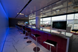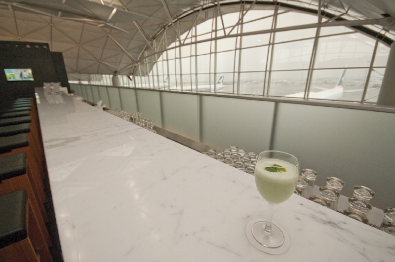 メインのソファーエリアは大きく広大。キャセイの航空機駐機エリアに向けられた「ザ・ロング・バー」は全長23mの白大理石のカウンターが一直線に伸びる。オリジナルドリンクが評判だ。