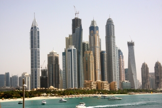 EAU(アラブ首長国連邦)のひとつであるドバイはペルシャ湾に面した貿易国で、海沿いに超高層ビルが乱立するが国土のほとんどは平らな砂漠。片側6車線に広がる道路を15分も走れば、荒涼とした赤茶色の世界が広がる。そして、そんな中にもときどき建設中のビルの鉄骨がポツンと現れる。中東・アジア・アフリカ・ロシアのハブとして、世界中のビジネスを誘致するドバイ。その成長は、まだまだ止まらないようである。