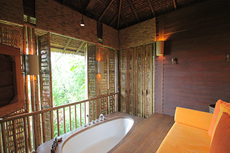 リゾートの建物は、竹などの自然素材が用いられていて素朴な雰囲気。写真に撮ると地味にも見えるが、これ見よがしな主張より、そこで過ごすゲストの居心地の良さを目的にしているからなのだろう。緑の中にしっくりと溶け込んでいる。私が滞在したのは、最もスタンダードなハイダウェイ・プール・ヴィラだったが、充分にゆったりしたレイアウトの快適な空間だった。