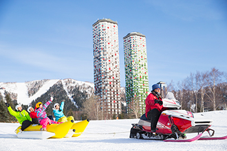 このほかにも、雪原を自分でドライブするスノーモービルツアーや、雪上クルージングを楽しむスノーラフティングやバナナボートなど、年齢や体力、そして度胸にあわせて挑戦できる、さまざまなアクティビティが満喫できる。滑るだけが冬山の楽しみ方じゃない。北の大地がみせてくれる豊かな自然の魅力を、思い思いに味わいつくせる時間がそこにはある。