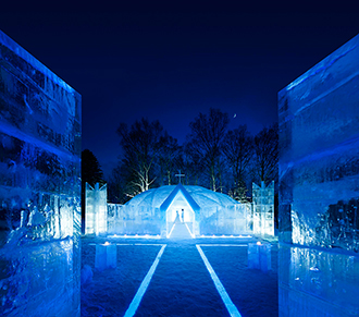 アイスビレッジのシンボルともいえる「氷の教会」。全てが氷と雪とで創られた幻想的な教会は、凛とした冷気とアイスブルーの光に包まれた厳かな空間。教会内を見学するだけでも新鮮な気持ちになれる。