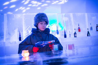 一晩過ごす自信のない方は、隣接する「氷のBAR」へ。氷でできたテーブル、椅子、バーカウンターが並ぶ店内で、氷のグラスでサーブされるオリジナルのカクテルを味わえば、極上の寒さを楽しむというこの街の流儀に共感していただけることだろう。