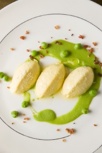 左:茄子と胸腺のタルト仕立てとフォッサチーズ 右:裸のラビオリ“ニュディ” エンドウ豆のソース