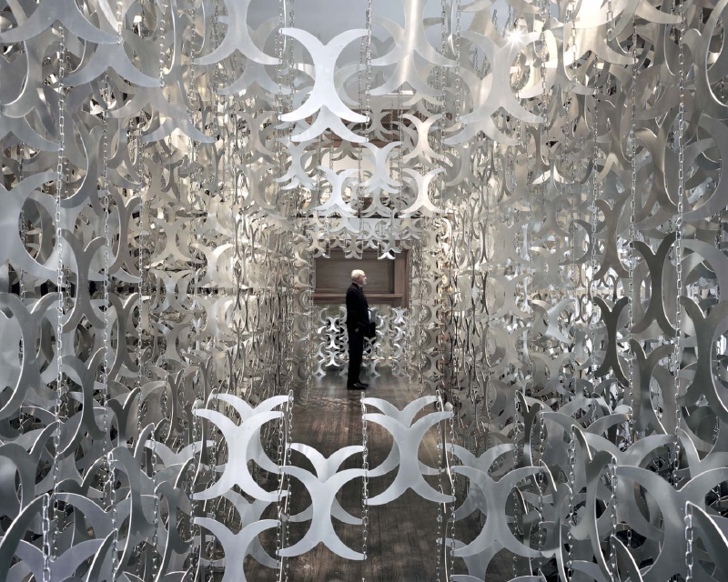 そして、もっとも目を引く展示のひとつが、『H_edge(ヘッジ)』だ。Hの形をしたアルミプレートとチェーンから成るこの大作。キラキラと美しく輝き、なかを歩いているだけで心地よい。しかし、それだけでないのが彼の作品。一見、Hのプレートがチェーンで吊るされているように見えるが、実は支え無しにピンと直立しているのだ。当然ながらプレートとチェーンは単独では自立しないが、規則的に組み合わせることでお互いを支え合う構造をもたせることができ るという。7000枚のプレートが2500mものチェーンを直立させる姿はなんとも圧巻であり、生命的な力強いイメージを喚起する