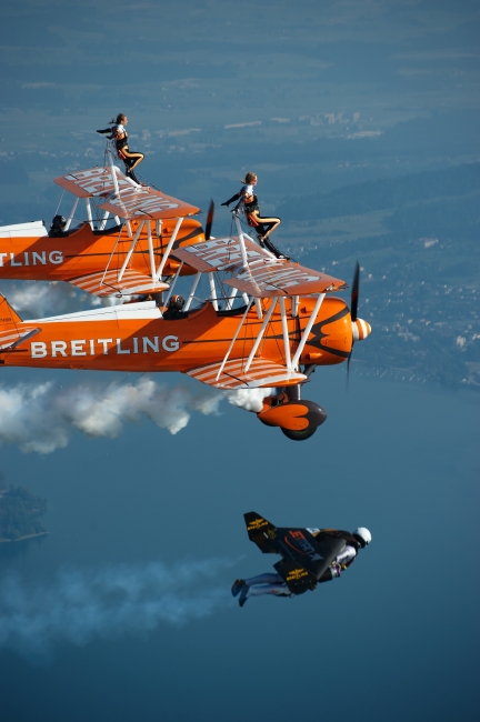 スイス・ニトヴァルデン州上空で行われたフォーメーション飛行の様子。2機のプロペラ機と近距離で飛ぶイヴ・ロッシー氏も凄いが、プロペラ機の主翼上でボージングする女性パフォーマーたちの度胸にも驚かされる。