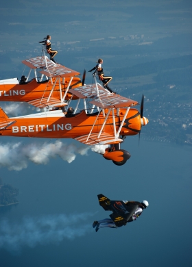 記念すべき第1回「ファウスト A.G.アワード」において、ファウスト大賞と冒険家賞をダブル受賞したスイス人冒険家、イヴ・ロッシー氏。4機のエンジンを搭載した“ジェットウィング”を背負い、ドーバー海峡横断飛行を始め前人未到の冒険に挑んできた彼が、去る6月2日、またもや世界の度肝を抜く快挙を成し遂げた。これまで単独での飛行に挑んできたロッシー氏は、今回初めて“パートナー”とのフライトに挑戦。高級時計ブランド「ブライトリング」のスポンサードを得た飛行チーム「ブライトリング・フライングウォーカーズ」のプロペラ機とタッグを組み、約6分間のフォーメーション飛行を成功させたのだ。