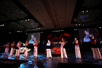 発表日となった6月10日、会場のグランドハイアット東京・グランドボールルームには、「SLS AMG」の予約者やセレブリティを含む、総勢400名もの来場者が集結。同車を象徴する鮮やかな赤を随所に配した会場内のステージには、5台の「SLS AMG」がずらりと並べられ、その雄姿に来場者たちの目はくぎ付けとなった。中央の1台から、メルセデス・ベンツ日本のニコラス・スピークス社長と上野金太郎副社長が颯爽と登場し、発表を祝った後は、来場者がステージめがけて殺到。迫力満点のガルウイングを開閉してみる人もいれば、上質なコックピットの座り心地をじっくり堪能する人もいて、ステージ上は「SLS AMG」の仕上がりを確かめる来場者で大賑わいとなった。パーティ中盤には、スペシャルゲストとして招かれたヴァイオリニストの高嶋ちさ子さんが登場。9名の女性ヴァイオリニストとともに優雅なステージを披露してパーティに華を添えるひと幕も。そして「SLS AMG」に試乗する人々はその後も後を絶たず、展示車の周りはパーティ終焉まで賑わっていたとか。