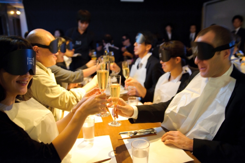 また、カップルや知人同士で参加しても、別々のテーブルに座らされてしまうことも、暗闇の世界に没頭させる、うまい演出だ。参加者は、たまたま同じテーブルについた初対面(と言っても声しか聞こえないわけだが)の参加者と会話をしながら、文字通り手探りで食事を楽しむことになる。