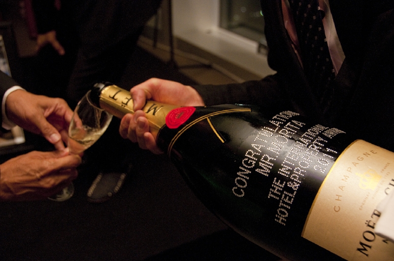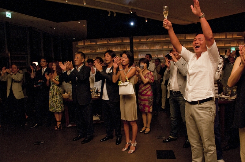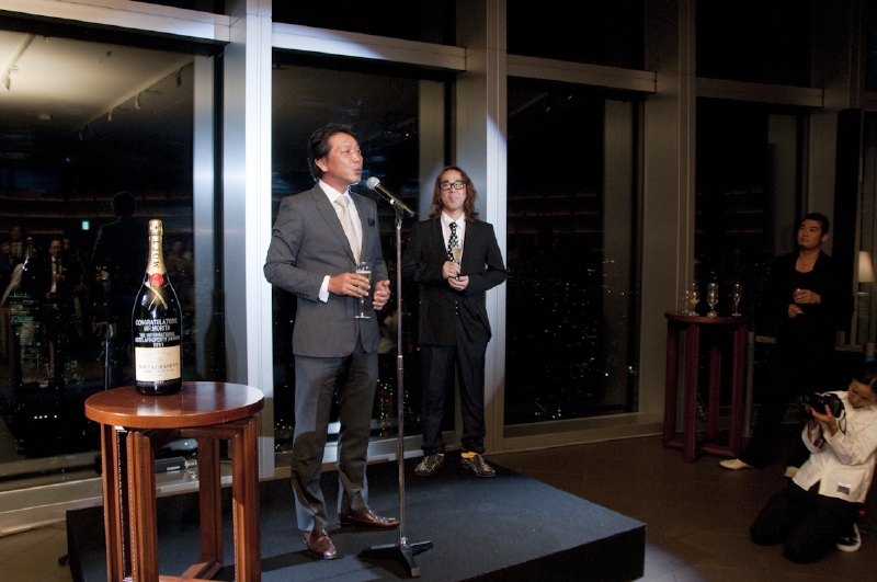 そしてさる8月某日、森田氏の受賞を祝うパーティが、東京・六本木のマドラウンジにて開催され、多くのゲストが出席、華やかなにぎわいを見せた。パーティは、森田氏とビジネスでもプライベートでも特に親交のある方々が中心となって催され、その発起人としてスティルフーズの鈴木成和氏、祝辞を述べたバルスの髙島郁夫氏、会場を提供したソルトコンソーシアムの井上盛夫氏、そして自らがMCを務めたゼットンの稲本健一氏が主催者として登壇。またMHDモエヘネシーディアジオのエリック・シモネ氏からモエ・エ・シャンドンで祝杯が贈られたほか、会場には各界の著名人が集い、皆が森田氏の快挙を心から温かく祝した。