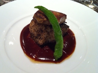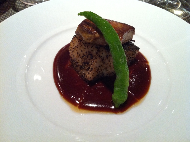余韻を残しつつ、部屋をダイニングへと移してディナーとなった。ROGEN氏の作品『COSMIC DANCE』は「とこぶし 車えび あん肝の冷菜 赤野菜辛子酢味噌ソース」に、『Black in Black』は「銀鱈の黒胡椒焼きとフォアグラのソテー テリヤキバルサミコソース添え」に。今度は墨アートを彷彿させる、NOBU氏の創造力溢れるコースが一皿ずつサーブされ、ゲストたちは「いつものNOBUの料理とは違った美味しさがある…」と感嘆を漏らしていた。