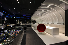 インテリアは「2001年宇宙の旅」をモチーフに、ミラーボディの1対のドール、バルセロナチェアやボールチェア、スタイリッシュな什器が配され、ミッドセンチュリーの近未来観漂う、ユニークな空間となっている。ラインナップは、IKE PODやヴェントゥーラなどデザイン性高いブランドや、ブライトリングやタグ・ホイヤーなど、高感度な品ぞろえが特徴だ。