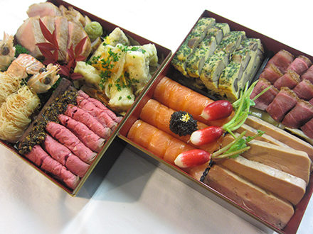 日本伝統の縁起かつぎを凝らしたフレンチテイストの新おせち、新しい年の趣向として正月の食卓に並べてはいかがだろう。