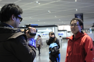 出発日、成田空港には『地球テレビ エルムンド』の撮影班も見送りに。