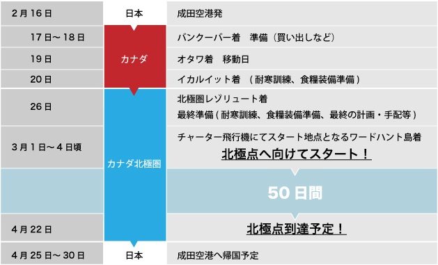 スタート後、北米大陸に近いうちは乱氷帯が続くことが予想され、ゴールまでの距離の最初の3分の1地点までは、荷物もまだ重いこともあり、およそ半分の25日を費やす予定。残り半分の25日で残り3分の2の距離を進み、北極点へ到達する計画という。