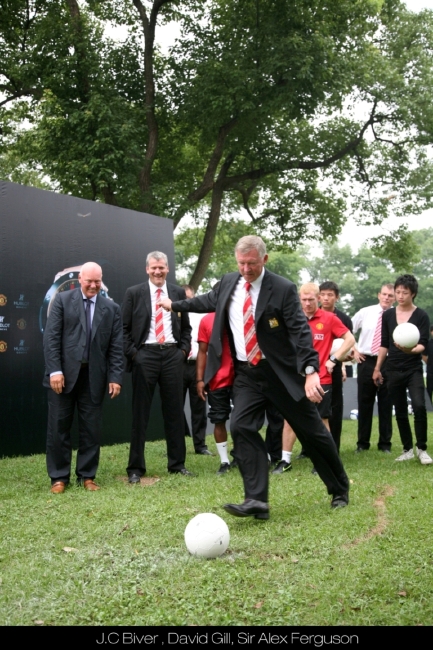 左/選手がだめなら、とチャレンジするマンチェスター・ユナイテッドのサー・アレックス・ファーガソン監督。右/なんとかゴールを、とシュートを放つウブロCEOのジャン・クロード・ビバー氏。