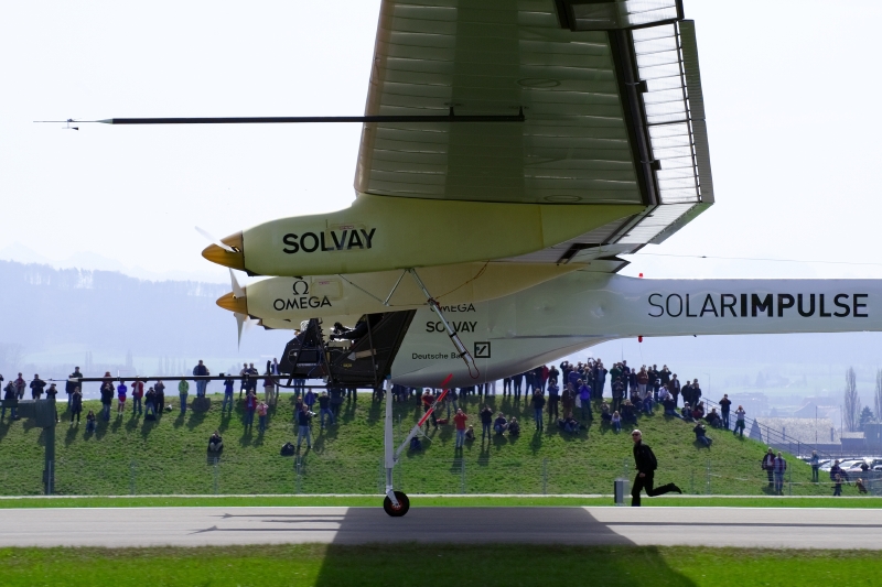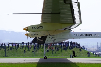 テストパイロットのマルクス・シャーデル氏を乗せたソーラー・インパルスHB‐SIAは、午前10時27分、スイス・パイエルヌ空軍基地を離陸。高度は1200mに到達し、87分間の飛行の後、着陸しました。今年2月のテストでは、飛行に成功はしたものの、高度は1m、距離350mという結果だっただけに、大きな前進といえるでしょう。