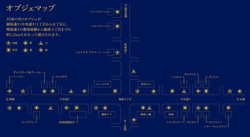 また同オブジェはLED照明を使用しており、さらに11月から銀座通連合会による呼びかけで会員の事務所等の電気の使用量の省エネ5%削減を目指している。翼のLEDカラーは、気品のあるブリリアントカラーを採用。オブジェ部分は柔らかみのあるイエローからディープブルー、ピュアホワイトへと美しいグラデーションを魅せてくれる。