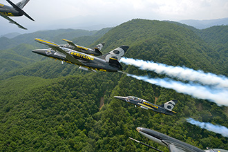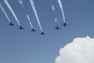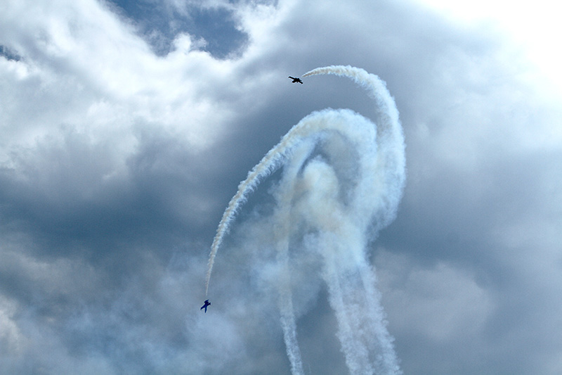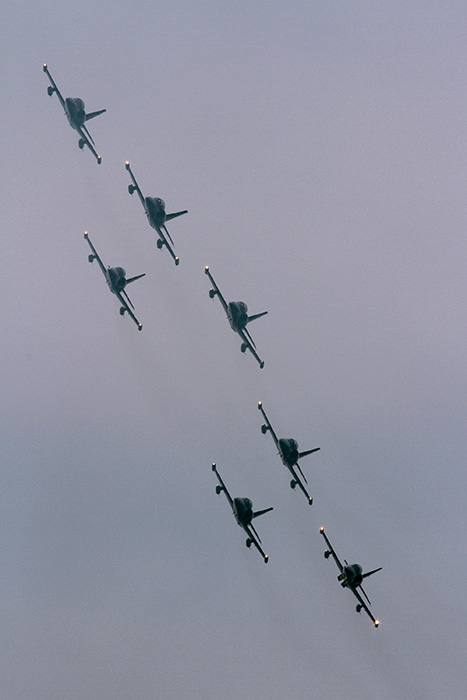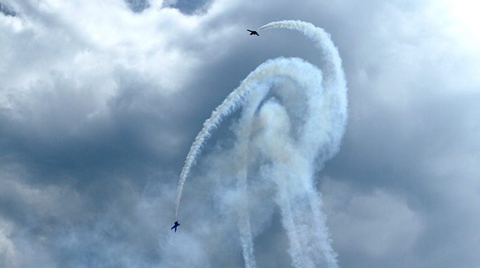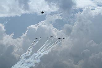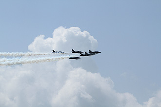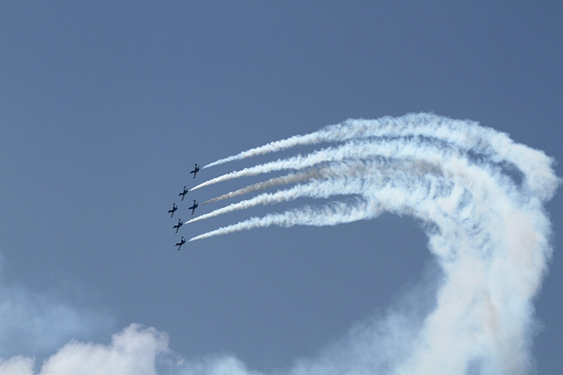 波のように進むグレーの流線型が頭上まで来ると、その姿は大海原で自由自在に戯れながら泳ぐイルカの群れのようだ。重なり合うジェットエンジン音は脳を刺激し、鳥肌の立つような興奮が沸き上がる。人間の二つの目では追いきれないほど左右に遠く離れた機体が、今度は全速力でのクロス。相対速度は最高時速1500km、互いの距離が3mとも5mとも言われる2機の交差。そして花火のように7機が弧を描き、山の向こうからスモークオンで大空に舞い散る。ファイナルブレイクと呼ばれる華やかなフィナーレだ。