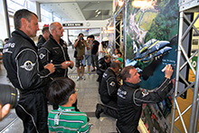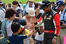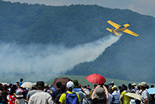 会場ステージでは、BJTのアジアツアー中、フィリピン・アンヘレスでBJTの機体に搭乗した航空評論家の中村浩美と、同じくフィリピンで搭乗したF1レーサー山本左近によるトークショウが行われていた。ブライトリングカラーのエクストラ300Lもハンガー前に駐機されている。出店では、様々な食べ物の屋台ほか福島の特産物の桃などが売られ、お祭りの様相だ。ジェットチーム到来の前には室屋義秀のフルアクロ。搭乗、離陸から着陸まですべてが眼前で行われる迫力あるホームでの演技に、会場は大満足。ディスプレイ後には室屋の元にできたファンの列がいつまでも途切れることがなかった。