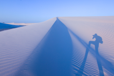 ブラジル北部の強烈な日差しが、真っ白な砂漠に反射して、無防備な肌が上からも下からも容赦なく光線にさらされる。暑い。汗が止めどなく吹き出す。裸足になり、砂丘を登る。足の裏に感じる細かな砂は、踏み出すたびにさらさらと流れ落ち、歩いても歩いても前に進む気がしない。それでもなんとか丘を越え、眼前に広がる景色を眺める。そして落胆する。いま苦労して超えて来た砂丘が、無数に何処までも続いているのだ。景色は変わらず疲労だけがたまって行く。それを何度か繰り返していると、なぜいま自分がここにいるのか、どこに向かっているのか、本当に歩いて前に進んでいるのか、わからなくなる。そんな時、立ち止まって振り返ってみる。白砂漠の中に自分の足跡が確かにひとつの筋となって残っているのが見える。風に吹かれて遠くのものは淡い輪郭を残すのみとなっているものの、それは確かにそこに存在している。